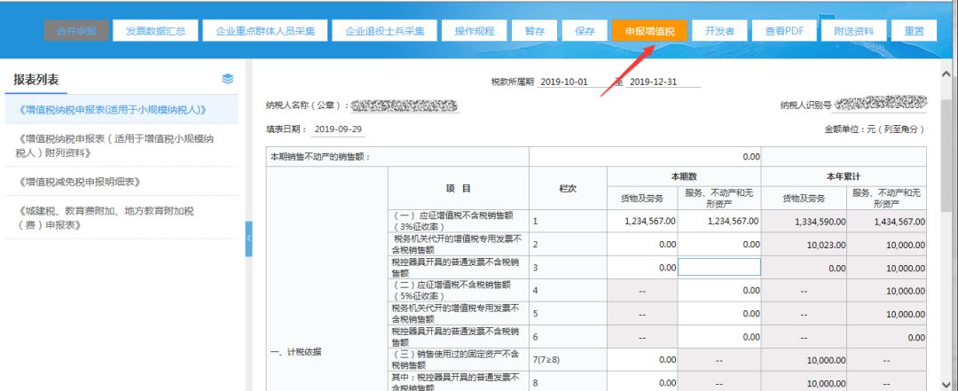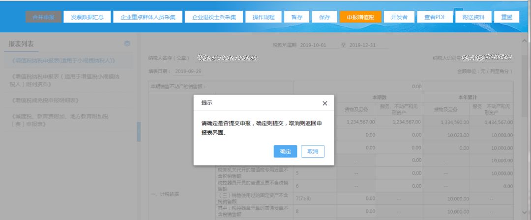 3)填寫完整增值稅小規模申報表后,點擊【申報增值稅】按鈕,系統僅提交增值稅申報;