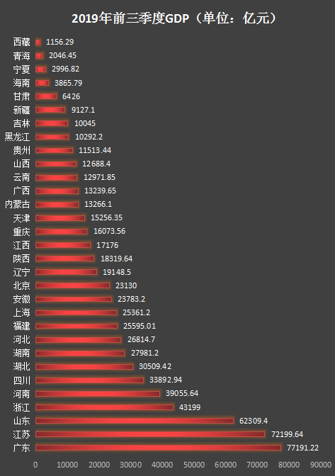 2019年前三季度,中國國內(nèi)生產(chǎn)總值697798億元,按可比價格計算,同比增長6.2%。同全國水平相比,云南、貴州、西藏、江西、福建、四川、湖北、湖南、安徽、河南、河北、浙江、山西、寧夏、廣東、江蘇、重慶這17省份前三季度GDP增速跑贏全國。