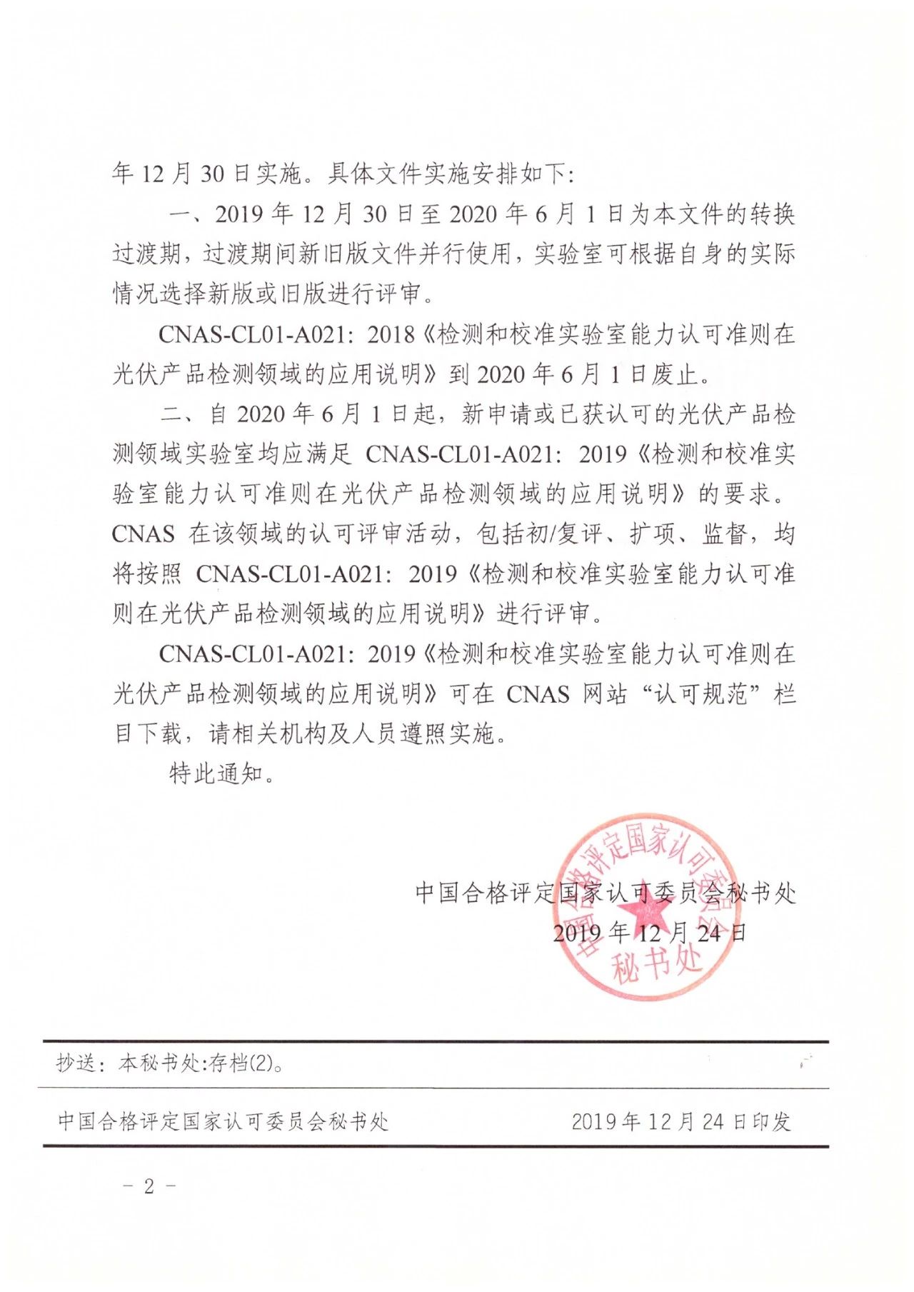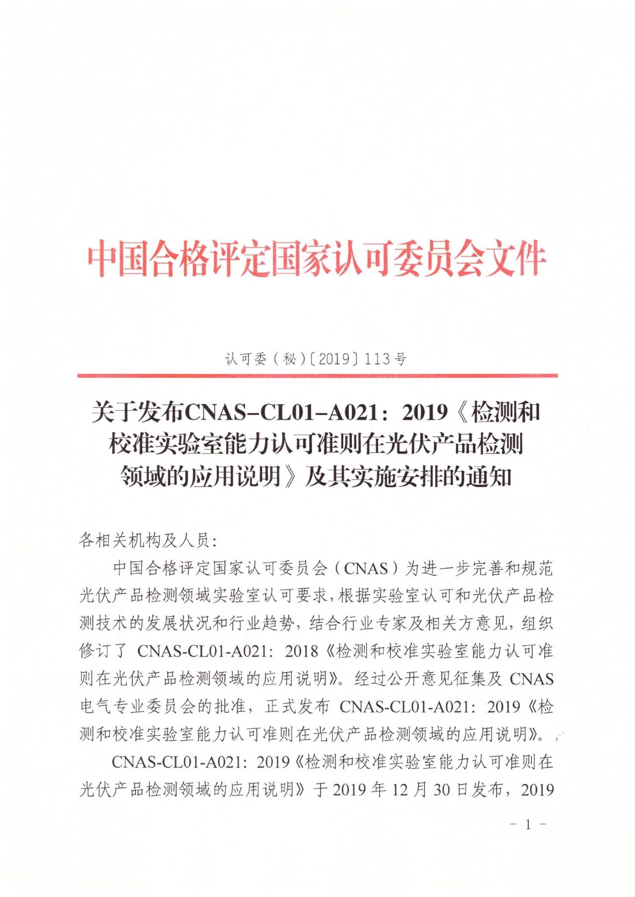 關于發布CNAS-CL01-A021:2019《檢測和校準實驗室能力認可準則在光伏產品檢測領域的應用說明》及其實施安排的通知