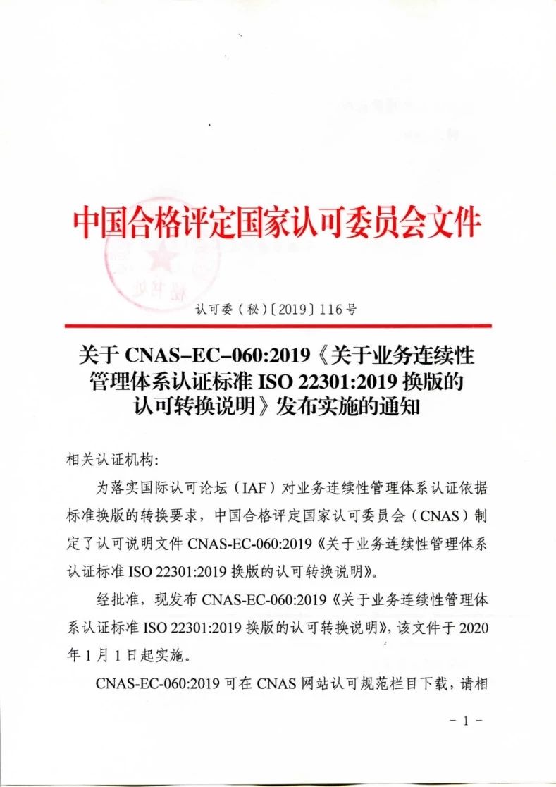 關于CNAS-EC-060:2019《關于業務連續性管理體系認證標準ISO22301:2019換版的認可轉換說明》發布實施的通知