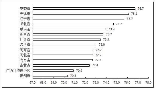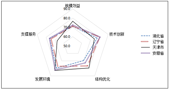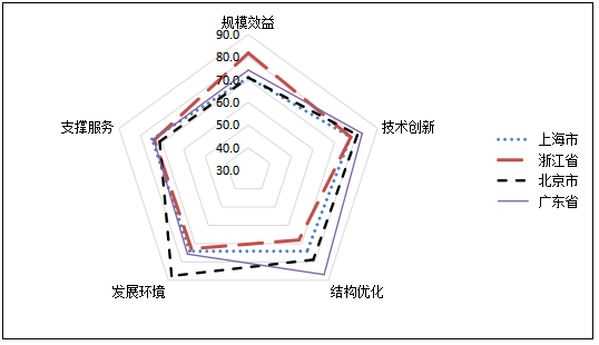 本年領先省份綜合發展指數均值為73.8,比上年上升2.5個分值,技術創新指數增長突出,廣東省綜合得分最高;中間省份綜合發展指數均值73.5,比上年上升3.4個分值,規模發展指數增長較快,安徽省綜合得分最高;潛力省份綜合發展指數均值65.0,發展環境指數增幅相對較快,山西省綜合得分最高;重點城市綜合發展指數均值69.0,比上年提高0.8個分值,支撐服務指數增幅突出,深圳市綜合得分最高。
