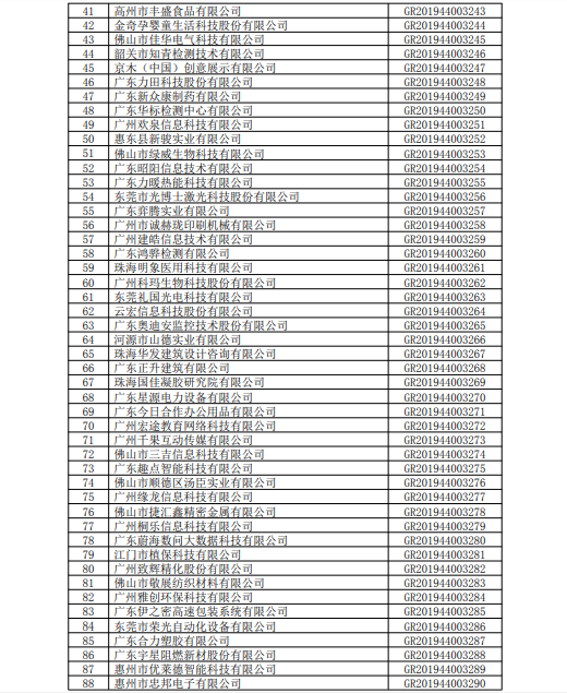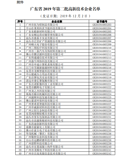 你們上報的《關于廣東省2019年高新技術企業認定備案的函》(粵科函高字〔20191730號)收悉。現將公示無異議的廣州市拓為鋁制品有限公司等4090家企業予以高新技術企業備案。請你們按照《廣東省2019年第二批高新技術企業名單》(詳見附件)中的企業名稱、高新技術企業證書編號和發證日期打印并頒發“高新技術企業證書”。